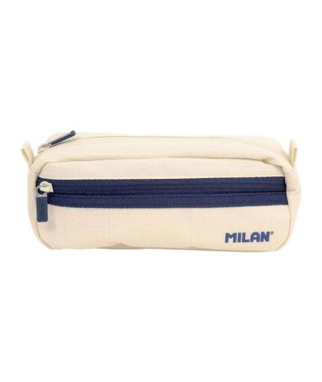Estuche portatodo rectangular con 2 cremalleras Serie 1918. Inspirada en los colores y diseño originales de las gomas de borrar MILAN, fabricadas en España desde 1918. Con un pequeño bolsillo frontal y un gran compartimento principal. Forro interior estampado azul marino con una cuadrícula que evoca las formas de las gomas MILAN. Tejido exterior \'ripstop\': ligero y resistente a la rotura y rasgaduras. Utiliza una técnica especial que teje hilos gruesos de refuerzo a intervalos regulares en un patrón entrecruzado. Especificaciones: -Estuche Rectangular -Cremallera color azul -Medidas: 21 x 8,5 x 6,1 cm -Composición tejido: Poliéster -Color: Beige