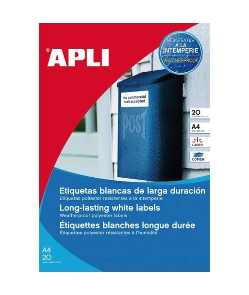 Etiquetas blancas de poliéster con acabado mate resistentes a la intemperie y a la corrosión ambiental. Las etiquetas de poliéster soportan condiciones extremas, resistiendo temperaturas de entre -20°C hasta +100°C. Ideales para marcaje de elementos y señalizaciones exteriores, así como envíos. Excelente calidad de impresión en impresoras láser o fotocopiadoras. Descarga el software gratuito para diseñar e imprimir todo tipo de etiquetas en www.apli.com